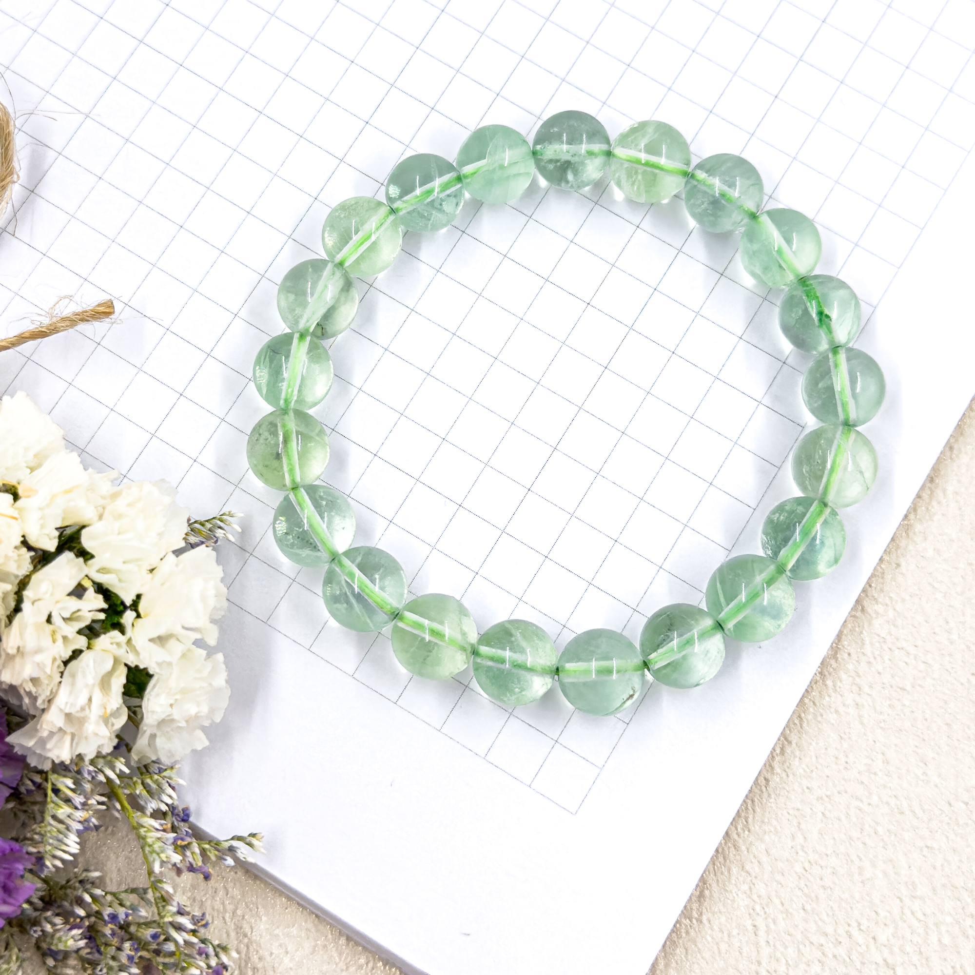 Each bracelet is crafted from natural green fluorite beads, selected for their soft mint green tone and balanced translucence. Internal variations are preserved rather than concealed, allowing each bead to express its natural character.