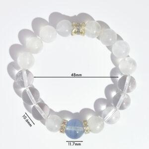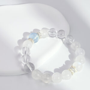 A cool, luminous strand that looks like moonlight on water. Milky-white Moonstone and ice-clear Quartz form a soft halo around a sky-blue focal bead, finished with sparkling gold-tone CZ accents. The palette is crisp, calming, and easy to wear—made for quiet confidence, kind words, and a centered start to your day.